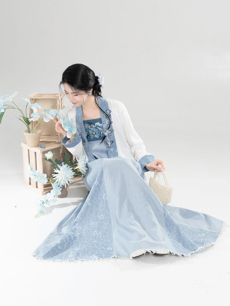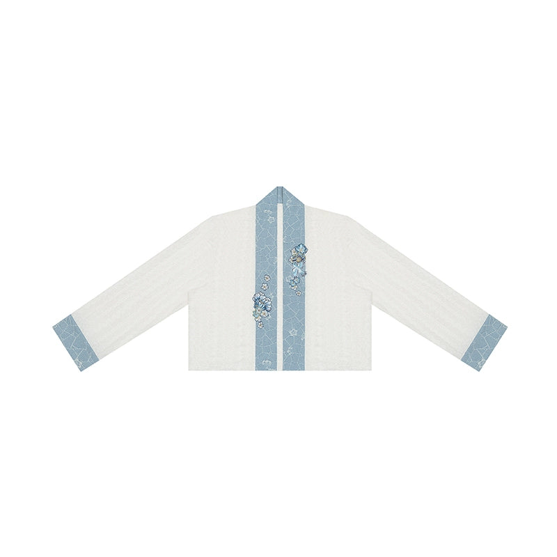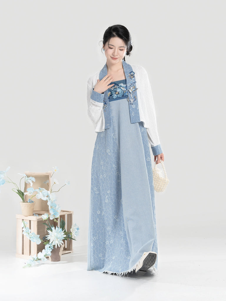 Qixue 栖雪 - New Chinese National Style Knitted Cross-Collar Short Cardigan with Camisole and Dress Set (Preorder)