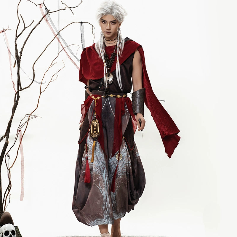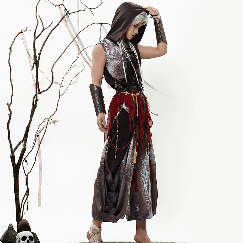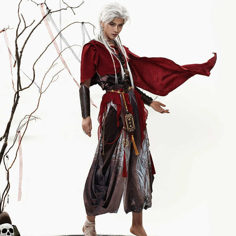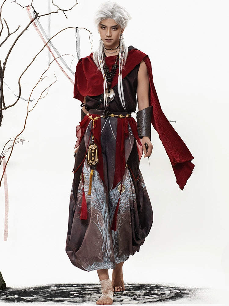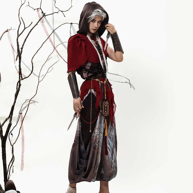 Crimson Feather 赤翎 - Hooded Sleeveless Hanfu Set with Cloak and Pants, Summer Martial Wanderer Outfit (Preorder)