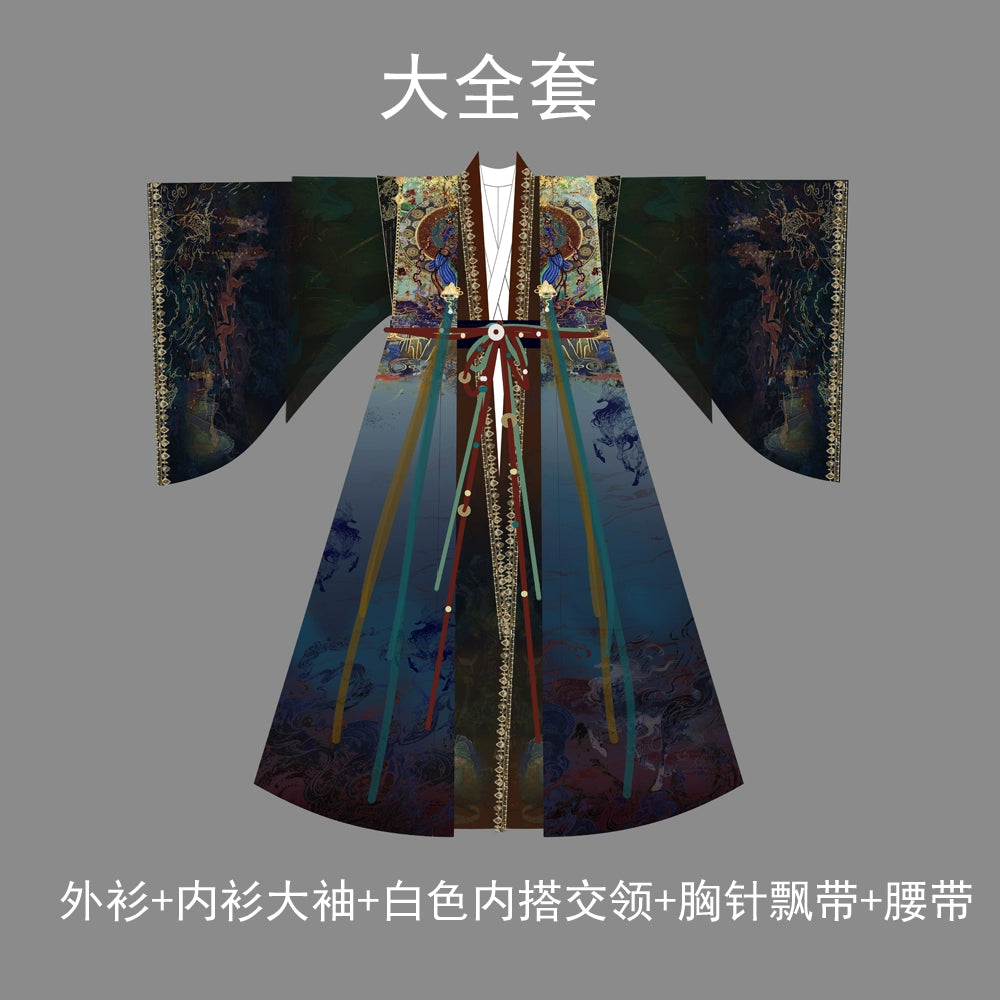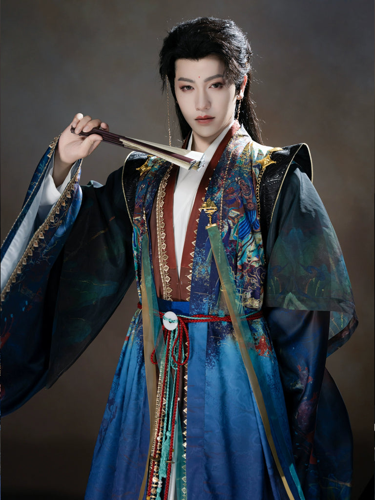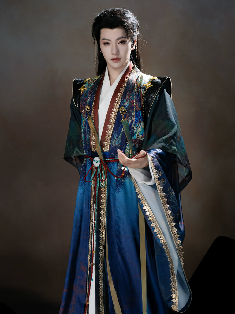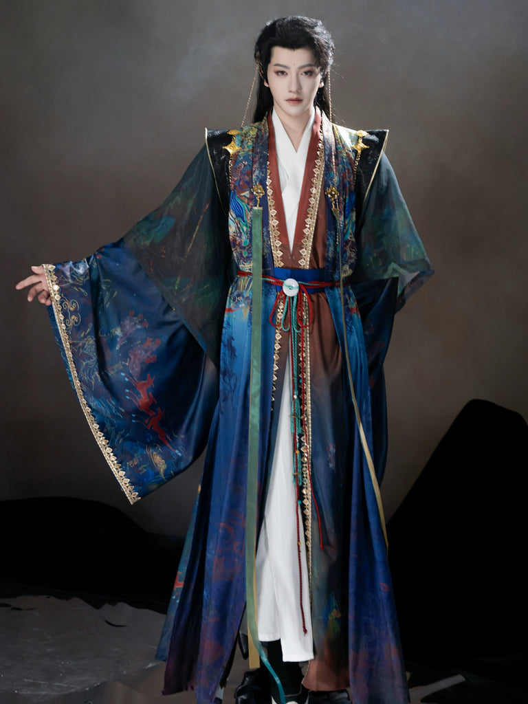 A striking male Xianxia Hanfu robe with unisex appeal. Ancient Chinese fantasy costume inspired by Dunhuang legends, perfect for cosplay, stage, or themed photoshoots. Dramatic design exude power and mystery.