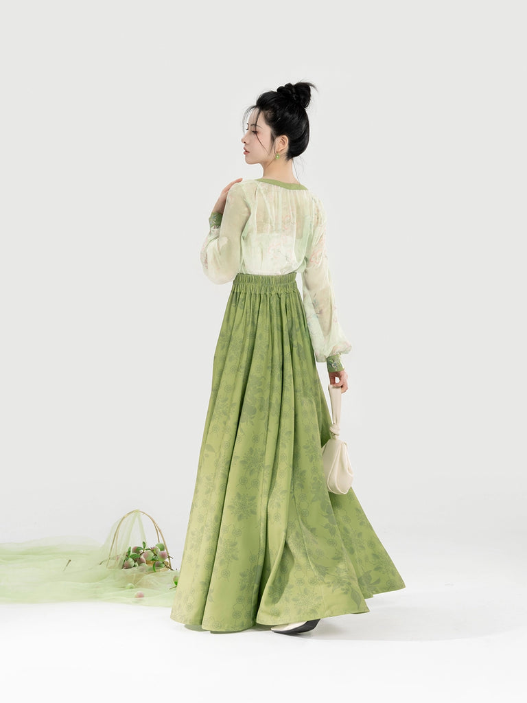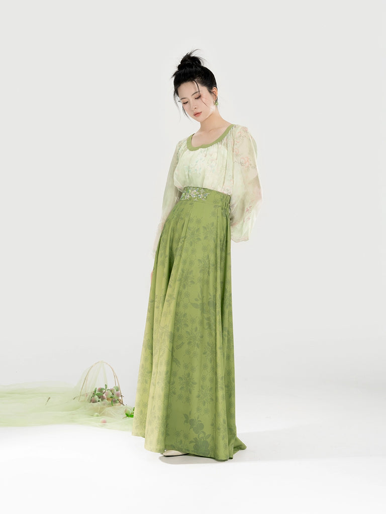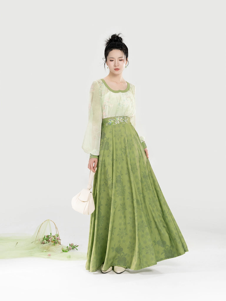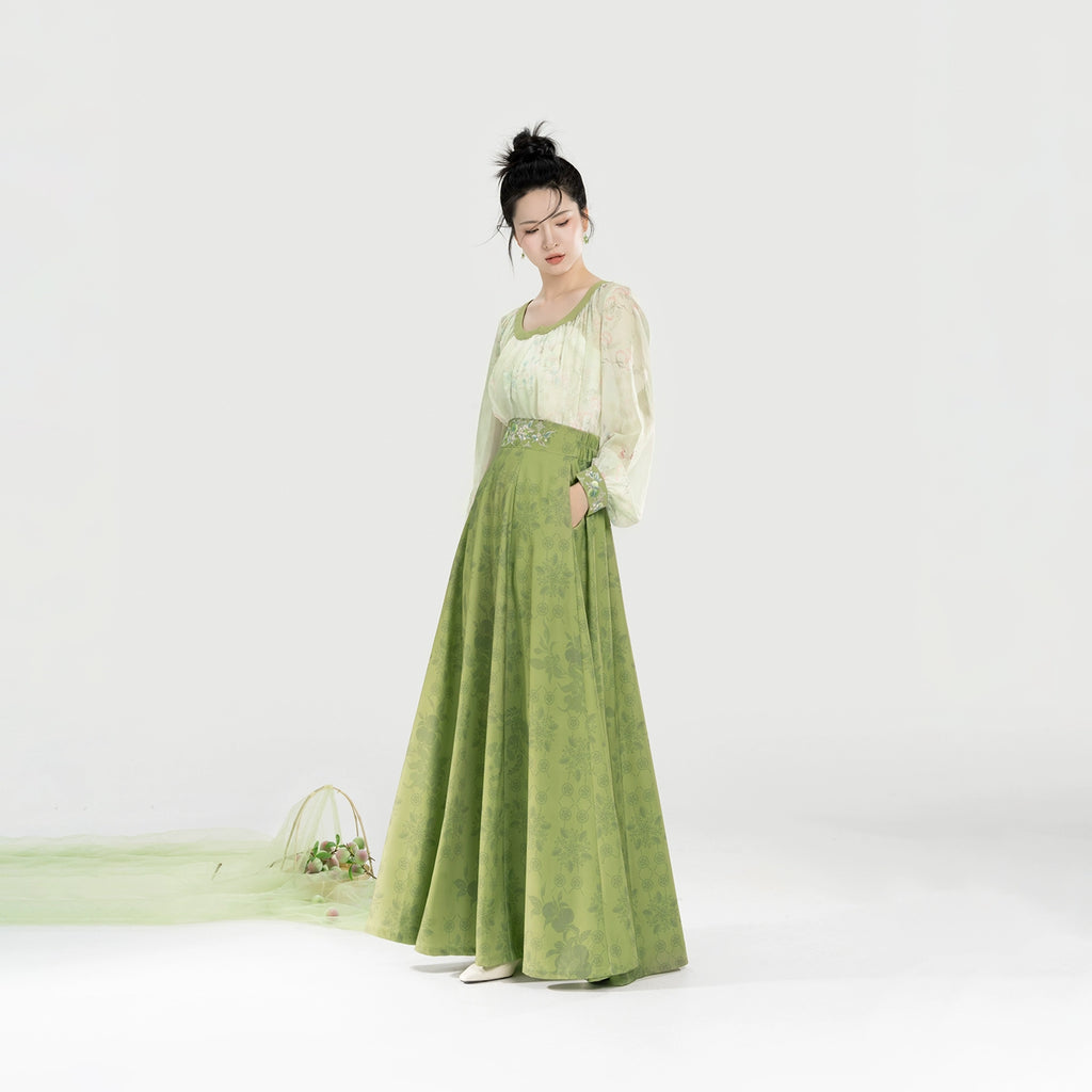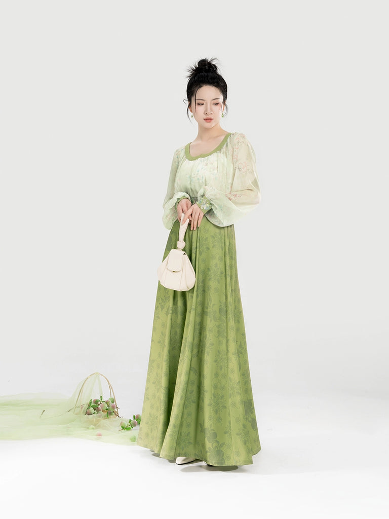 Qingmei Lane 青梅弄 - Modern Tang Dynasty Hanfu Sweetheart-Neck Lantern-Sleeve Blouse with Eight-Panel Skirt (Preorder)