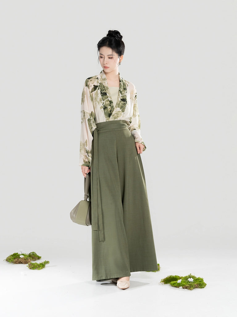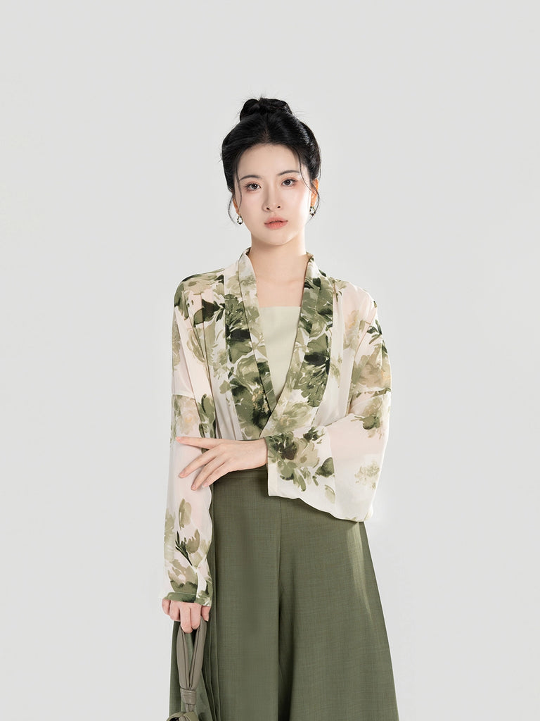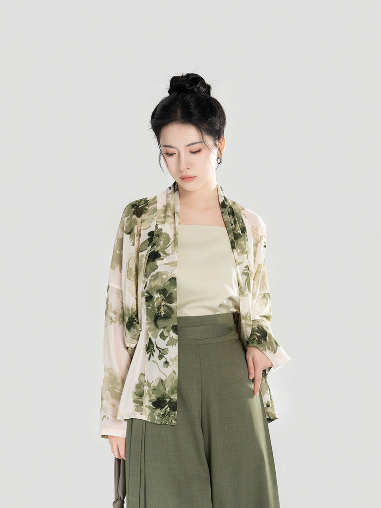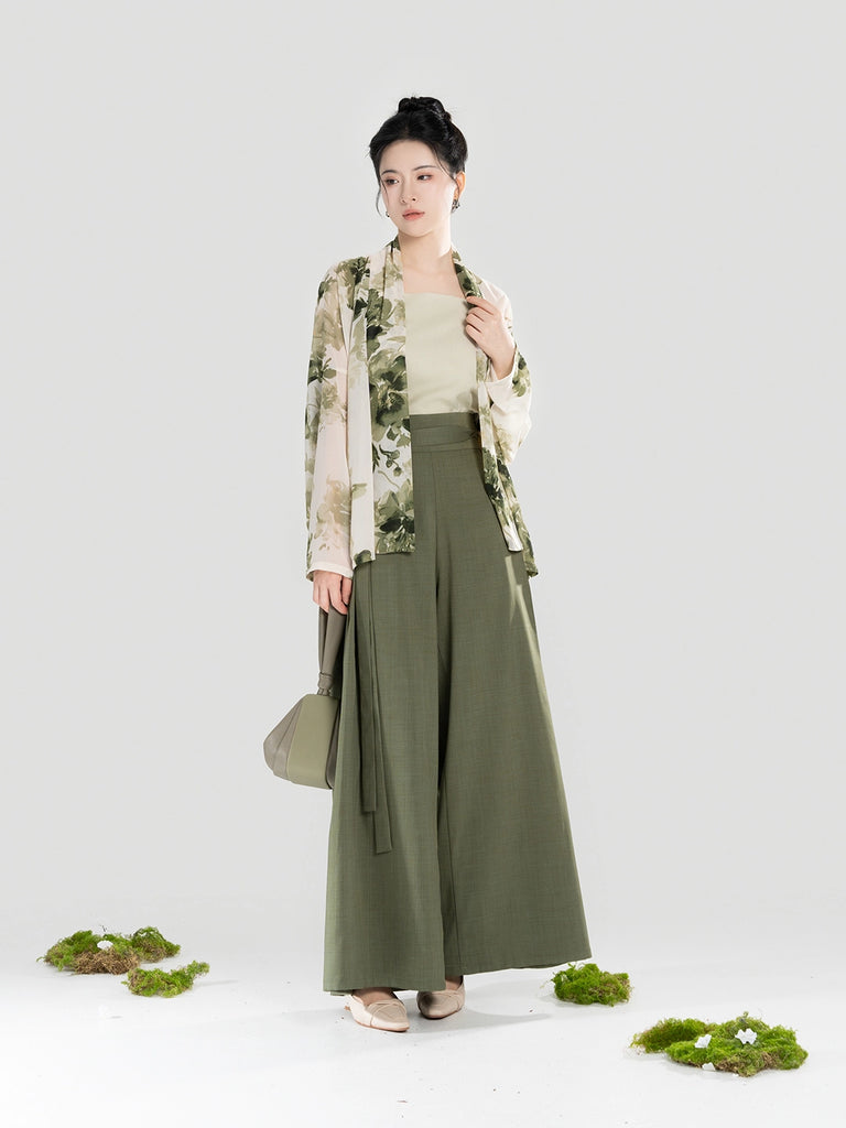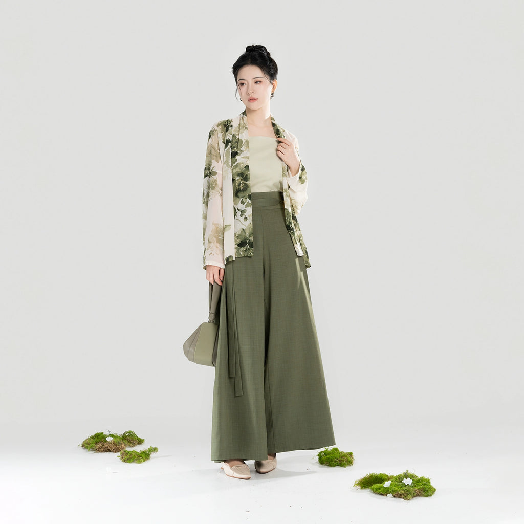 Spring Grass 春草色 - Modern Hanfu Song-Style Cardigan with Camisole and Wide-Leg Pants (Preorder)