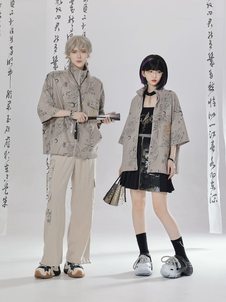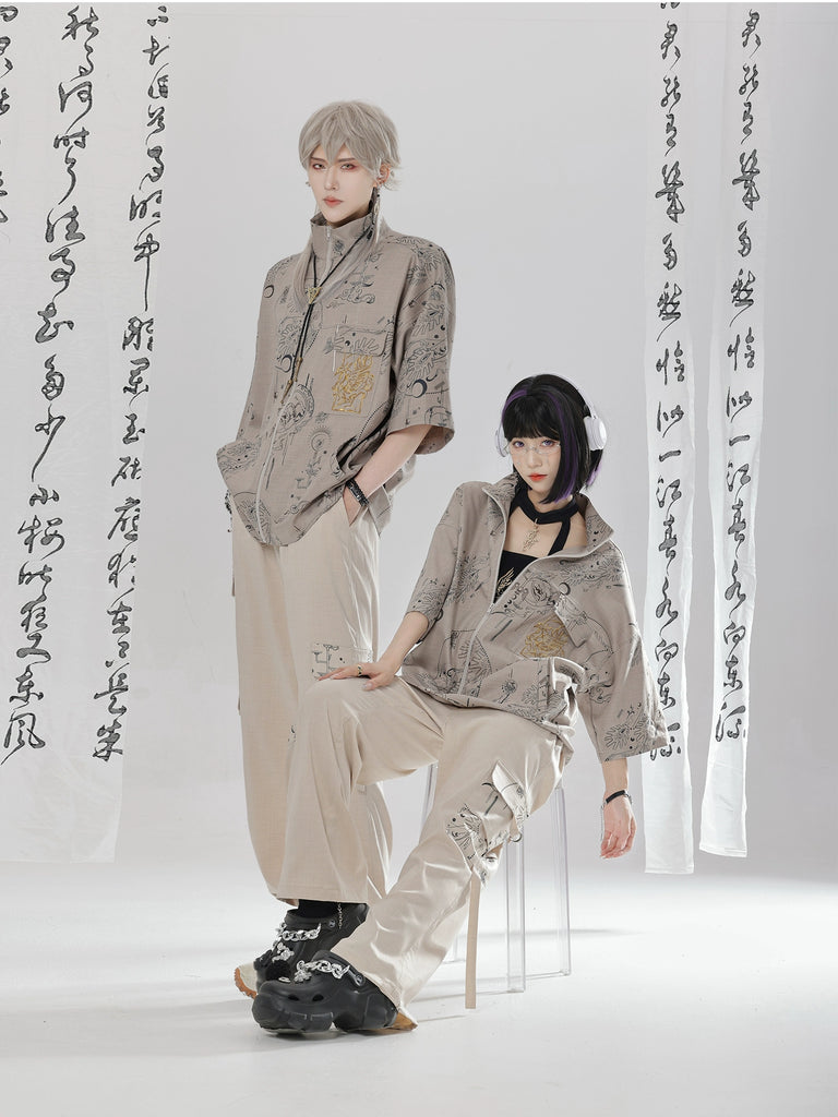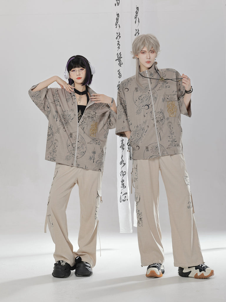 Sand Dunes - New Chinese Style Zipper Short Sleeve Shirt Overalls Cargo Pants