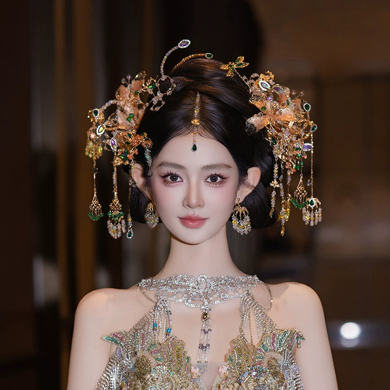Champagne Bridal Hair Accessories Exquisite Forehead Pendant Headpiece for Chinese Wedding Xiuhe and Hanfu Bride