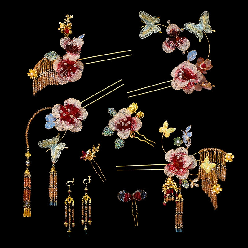 Spark of the Golden Orchid - Gradient Floral Bridal Hair Accessories Light Butterfly Headpiece for Chinese Wedding