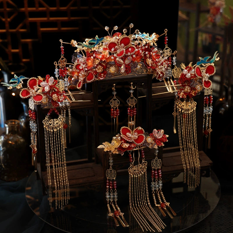 Twilight Azure - Red and Blue Phoenix Crown Bridal Headpiece Handmade Tassel Chinese Wedding Hair Accessories for Hanfu Bride