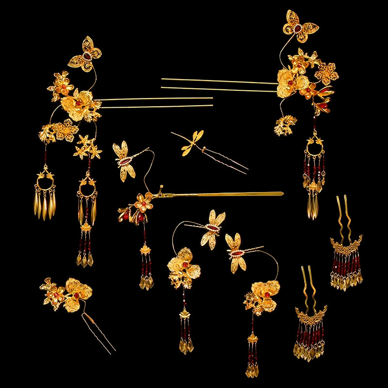 Red and Gold Floral Bridal Hair Accessories Handmade Butterfly and Dragonfly Hairpins for Chinese Wedding Xiuhe Dress