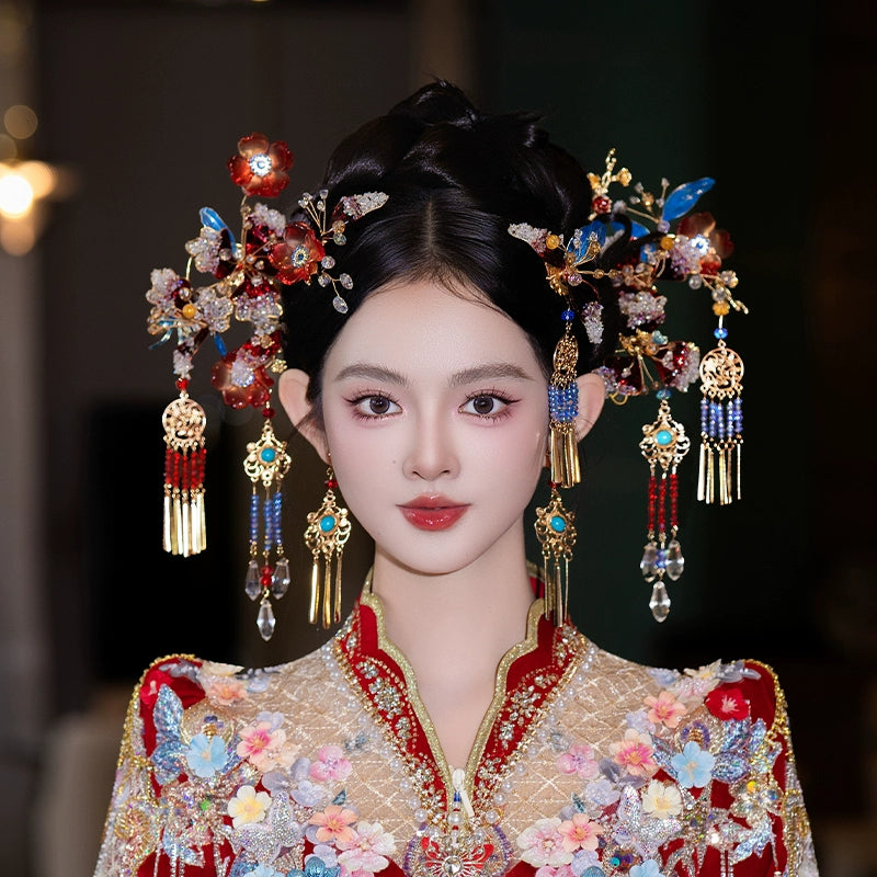 Unique Red and Blue Bloom - Bridal Hair Accessories Chinese Wedding Headpiece for Hanfu and Xiuhe Dress