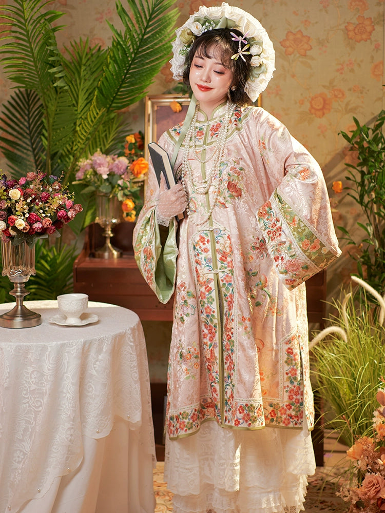 After the establishment of the Qing dynasty, the Manchu clothing system influenced Han clothing to some extent. However, Han women did not fully adopt Manchu-style qizhuang (banner attire)and instead preserved elements of Ming-style Han clothing, such as skirts, pleated skirts, and ruqun (blouse and skirt ensembles). That said, the structure, decoration, and tailoring of these garments evolved, making them distinct from traditional Hanfu. As a result, they are categorized as Qing dynasty Han women's attire rather than Hanfu.