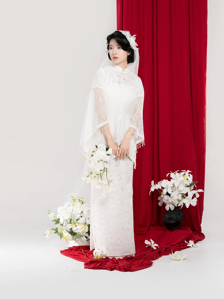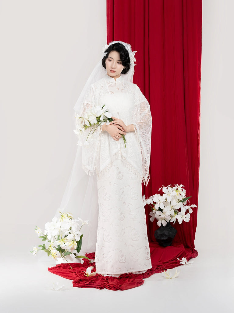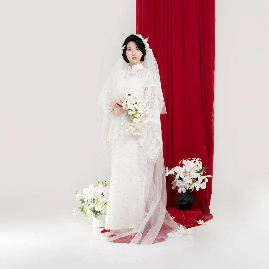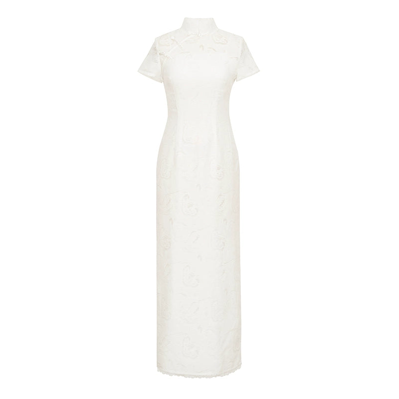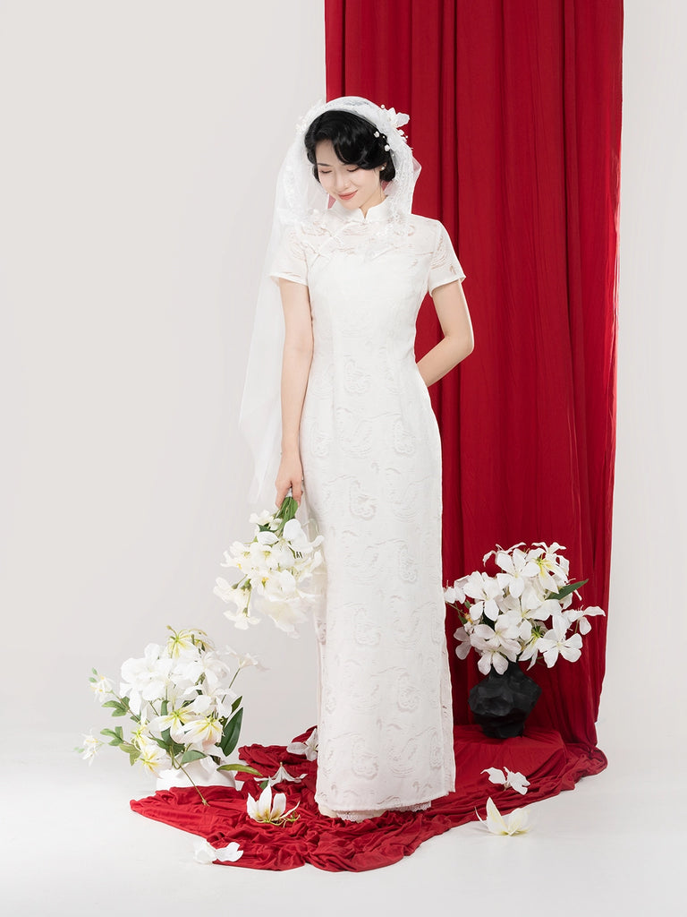 Longing 长相意 - Short Sleeve Long Bridal Wedding Cheongsam (Preorder)