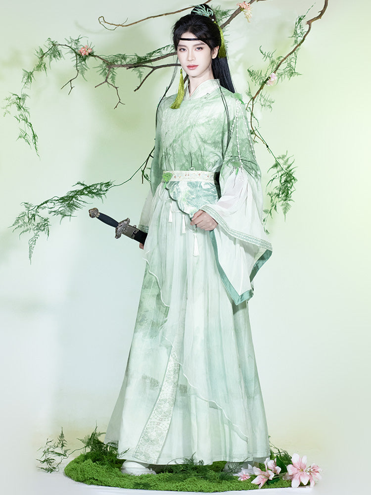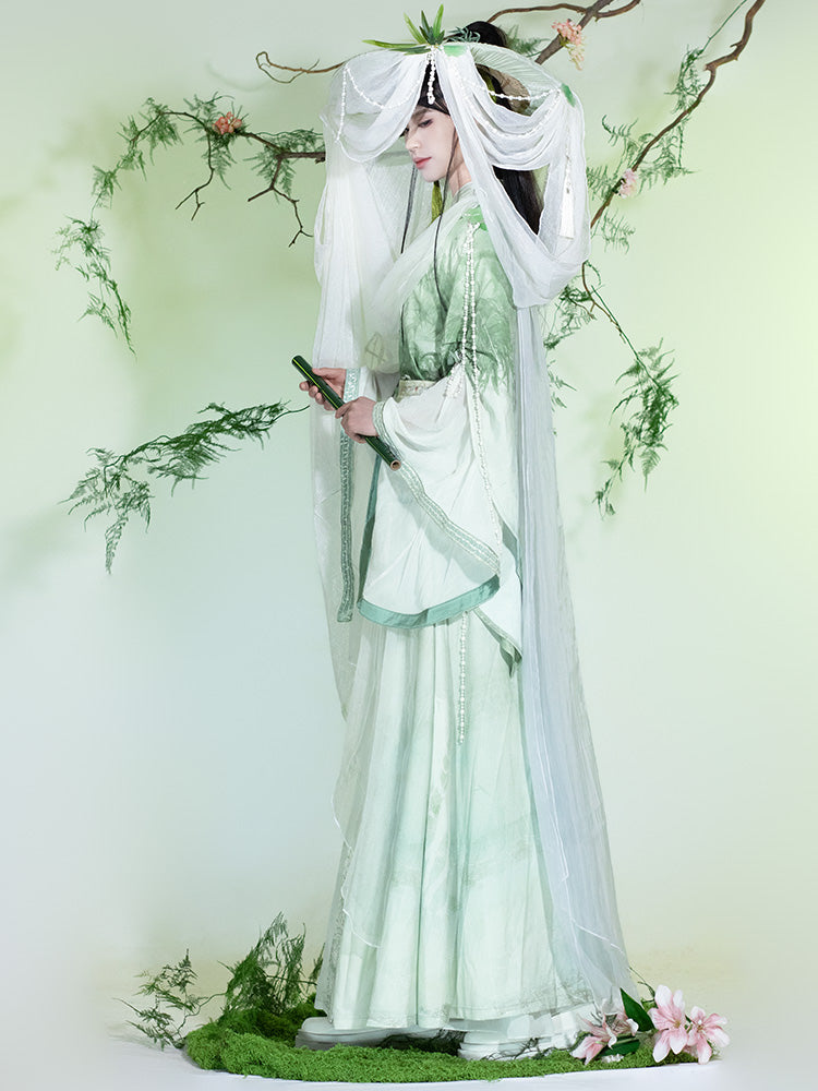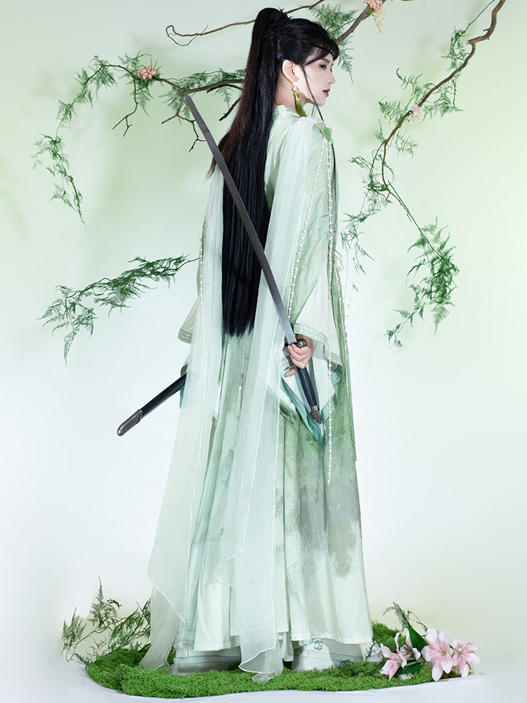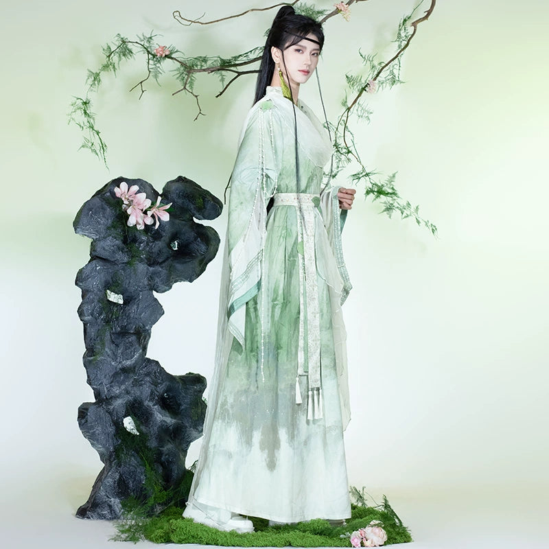 Fuyun 扶筠 - Round-Collar Embroidered Green Wide-Sleeve Xianxia Hanfu Set (Preorder)