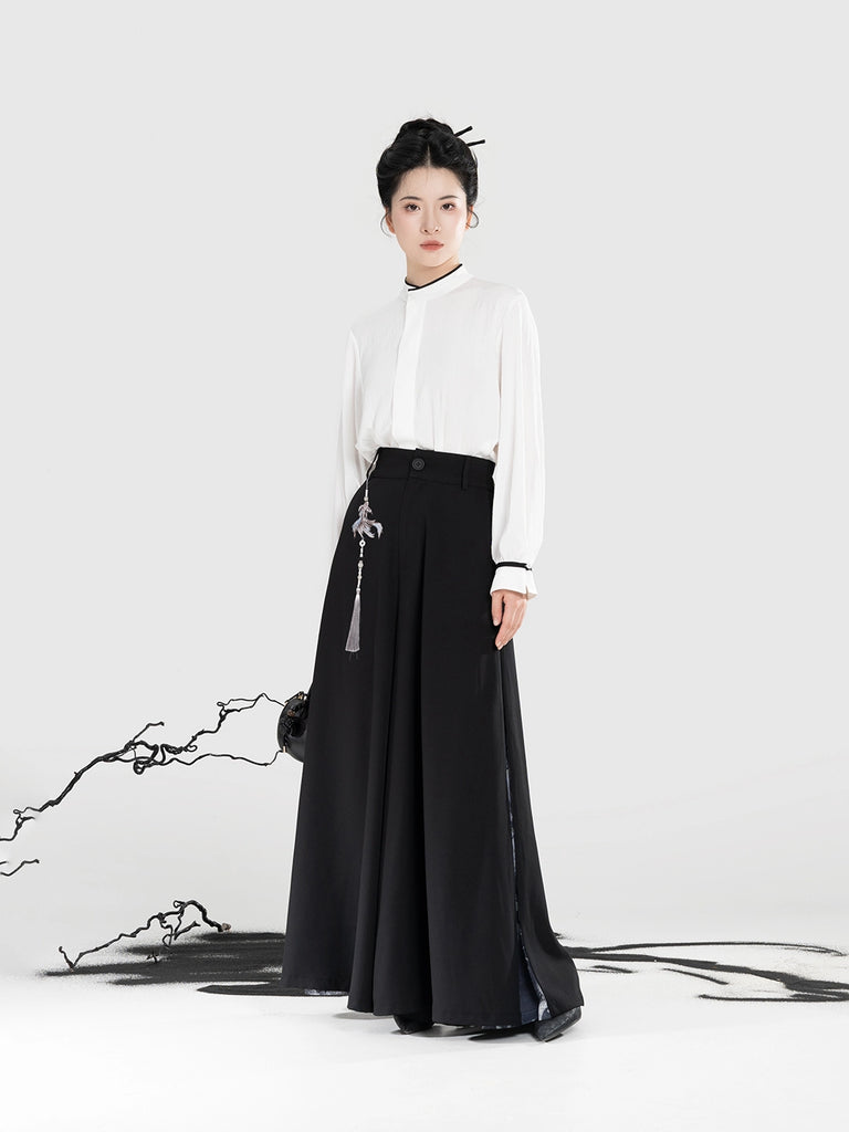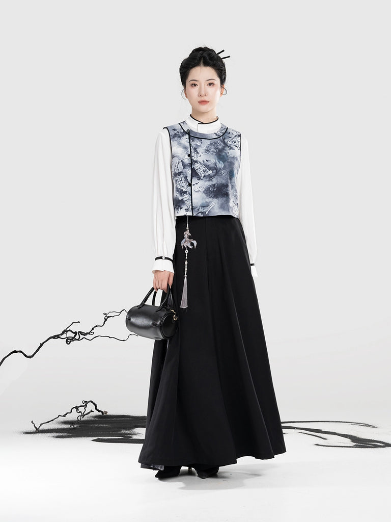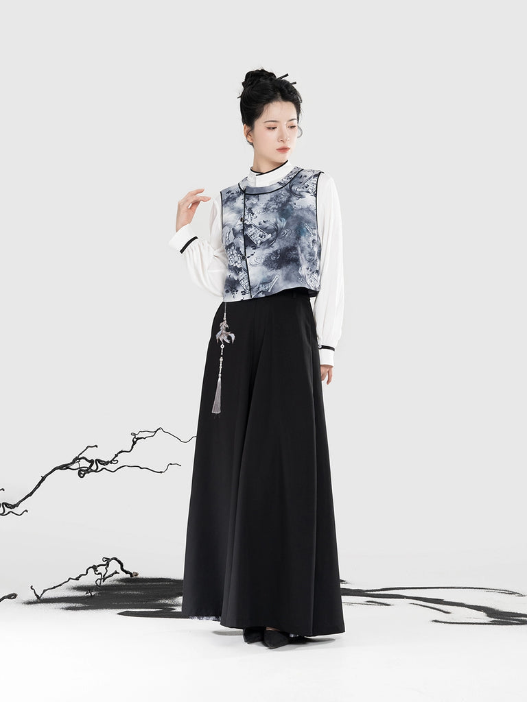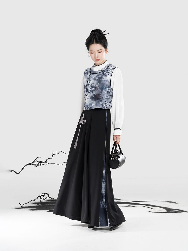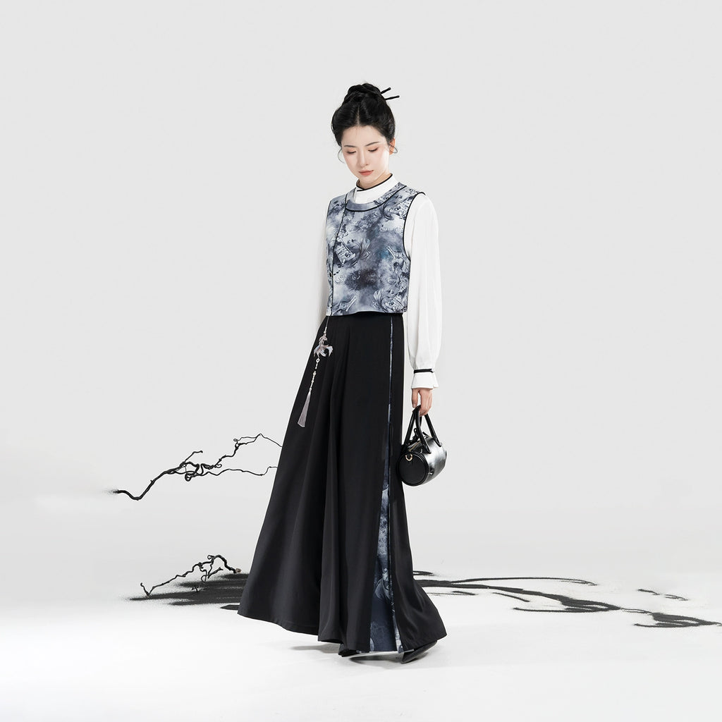 Fish In Water 如鱼得水 - Modern Tang Dynasty Hanfu Ink-Style Vest with Stand-Collar Shirt and Pleated Wide-Leg Song Pants (Preorder)