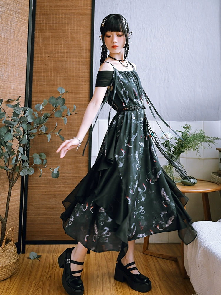 Harrier 鸰鹞 - New Chinese Summer Loose Print Slip Dress