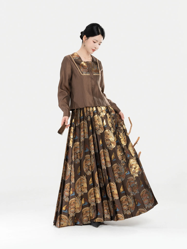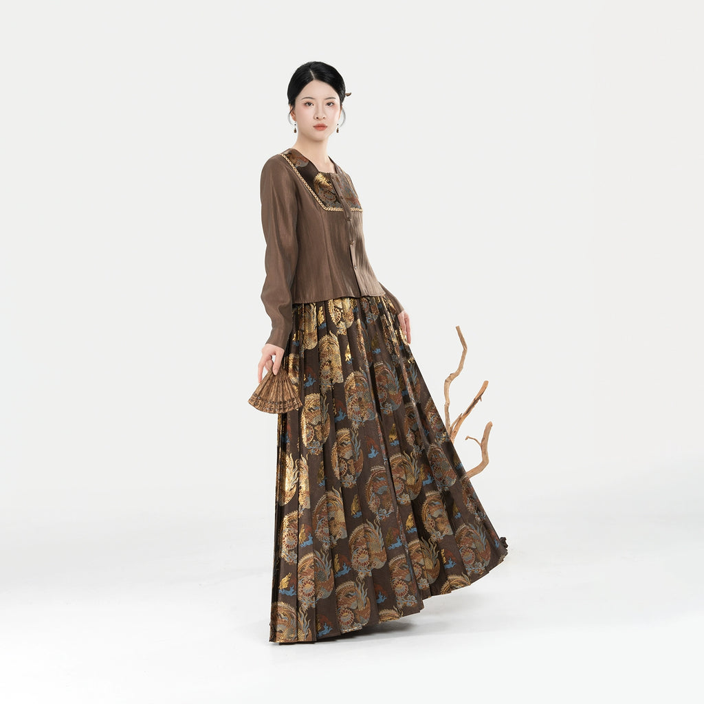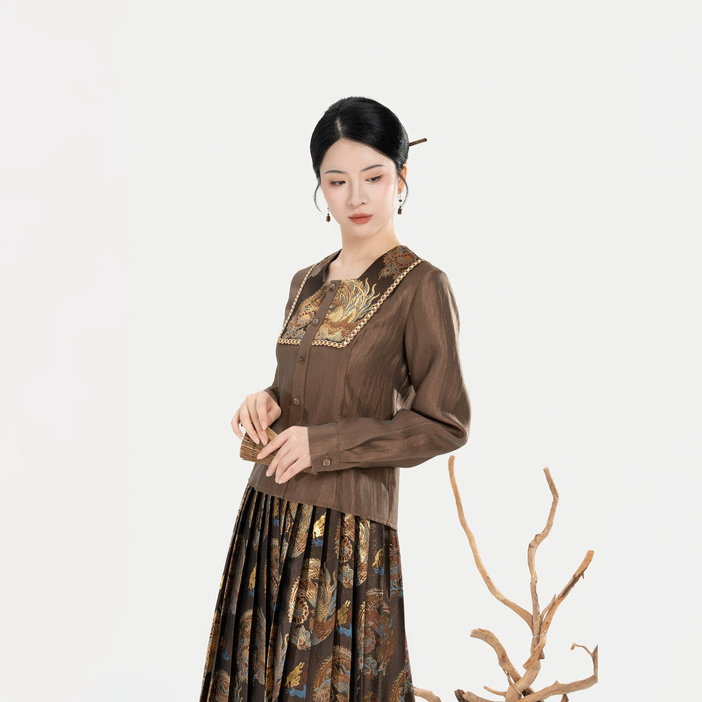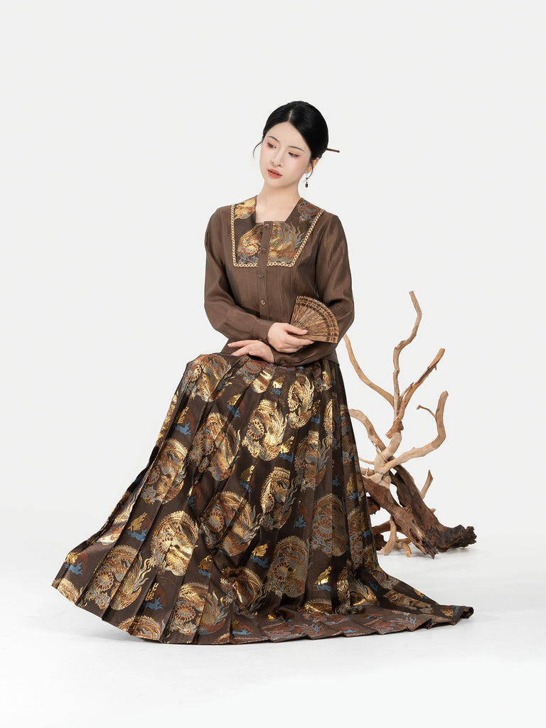 Zhaowu昭梧 - Modern Ming Dynasty Brocade Square-Neck Shirt with Phoenix and Lotus Motifs Pleated Skirt Set (Preorder)