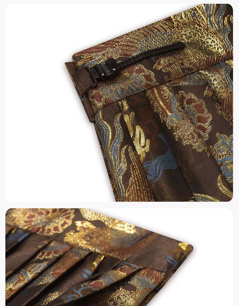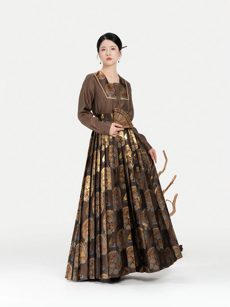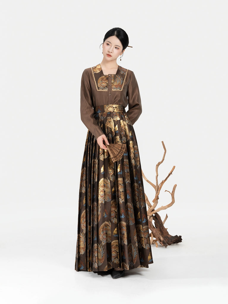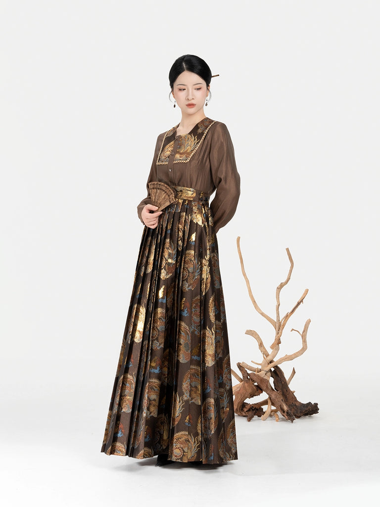 Zhaowu昭梧 - Modern Ming Dynasty Brocade Square-Neck Shirt with Phoenix and Lotus Motifs Pleated Skirt Set (Preorder)