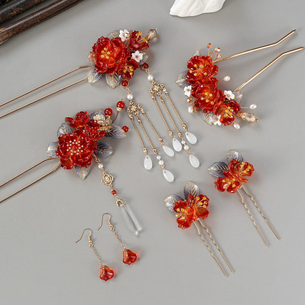 Festive Red Blossom Hair Accessories Hanfu Hairpin & Tassel Set for Traditional Hairstyles