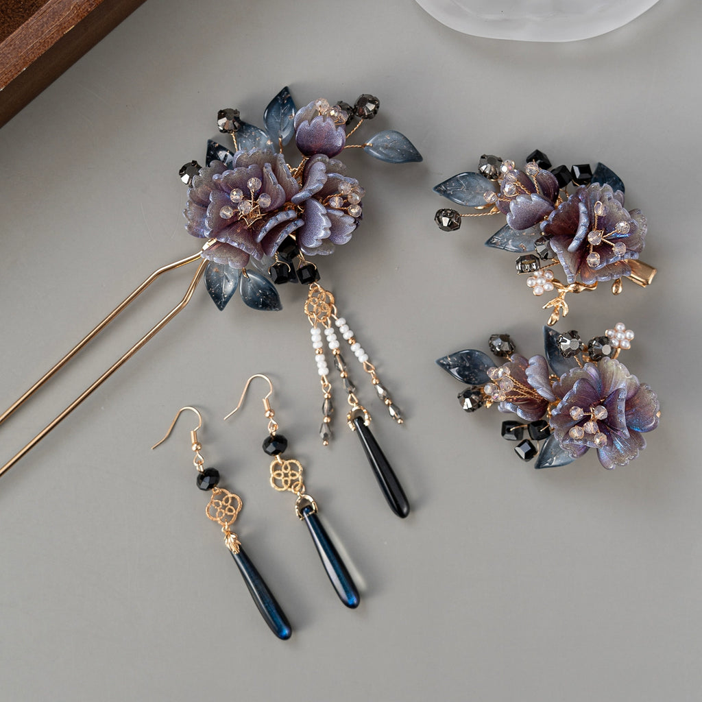 Ink Cloud Dark Purple Floral Hanfu Hair Accessories Set