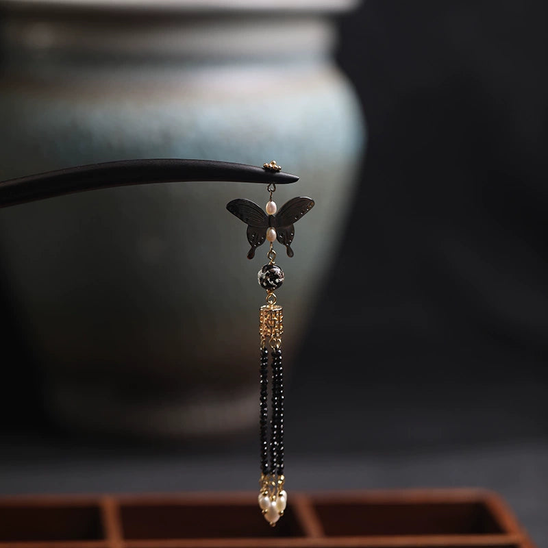 Ink-Stained Pearl Tassel Natural Mother-of-Pearl Long Tassel Ebony Hair Stick