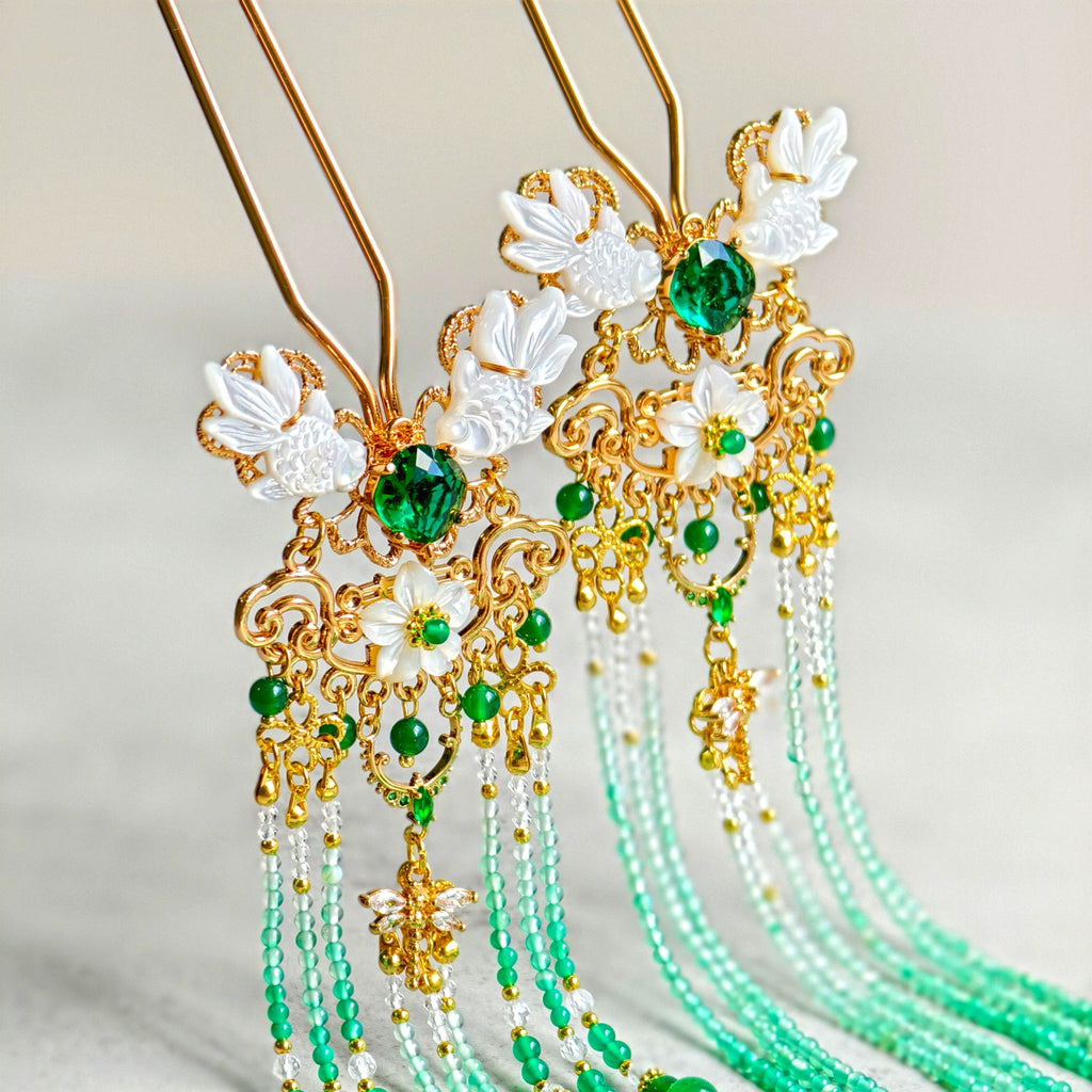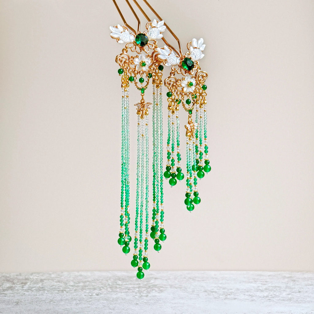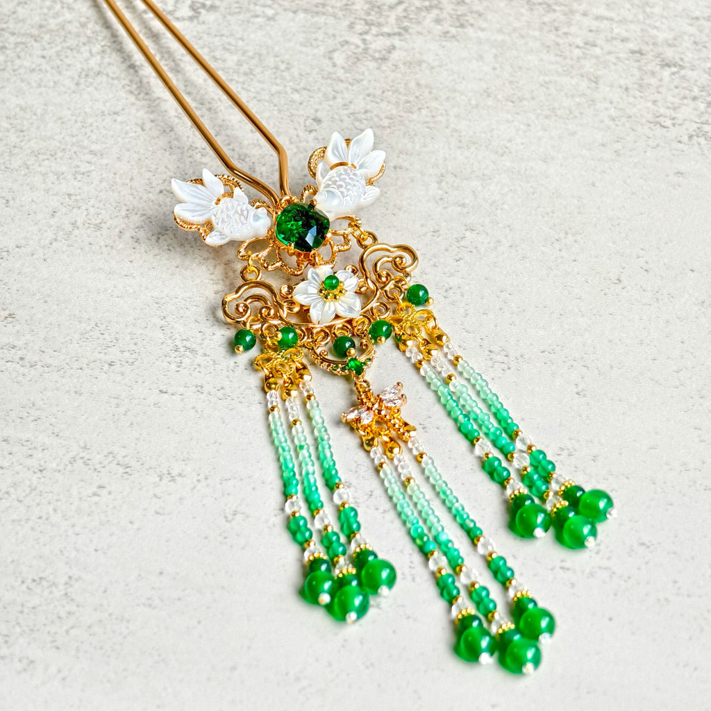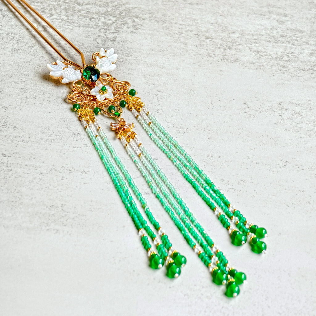Lotus Pond Green Agate Hairpin U-Shaped Tassel Hanfu Hair Stick