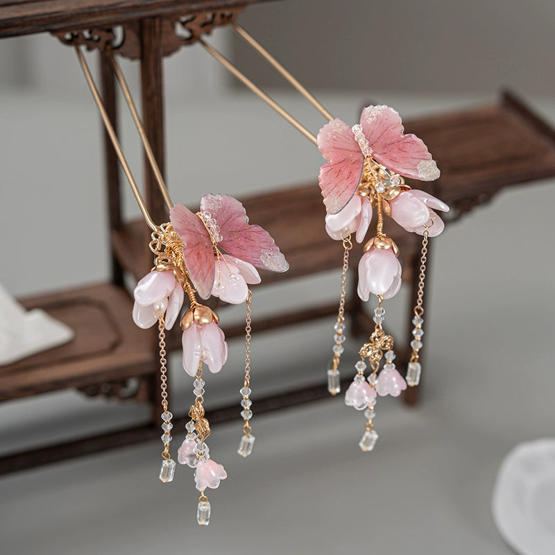 Peach Blossom & Magnolia Butterfly Hairpin Ancient Style Tassel Hair Stick for Hanfu & Cheongsam
