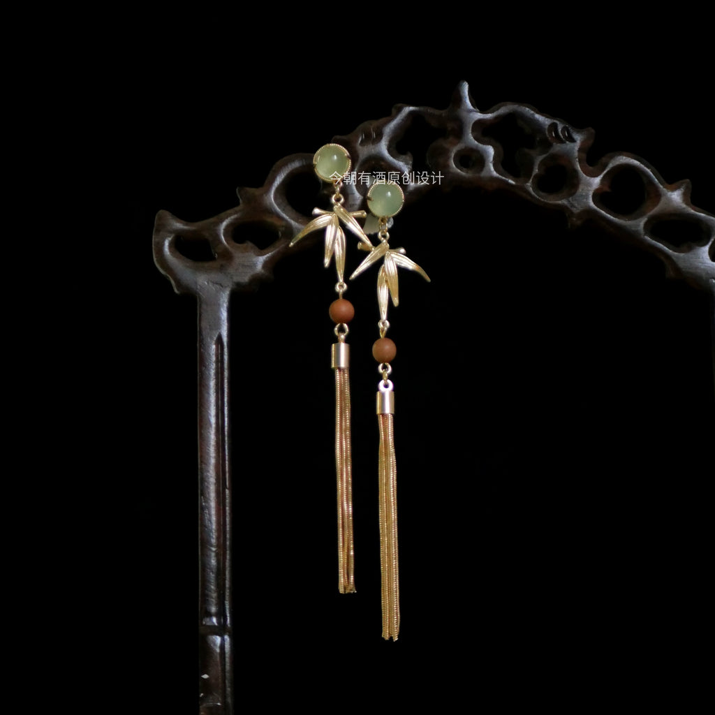 Golden Bamboo Leaf Hetian Jade Chinese Earrings