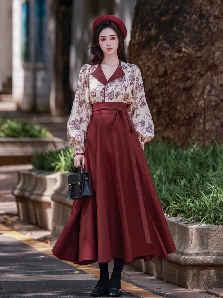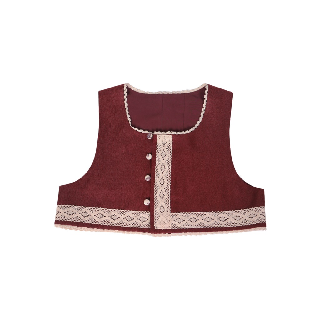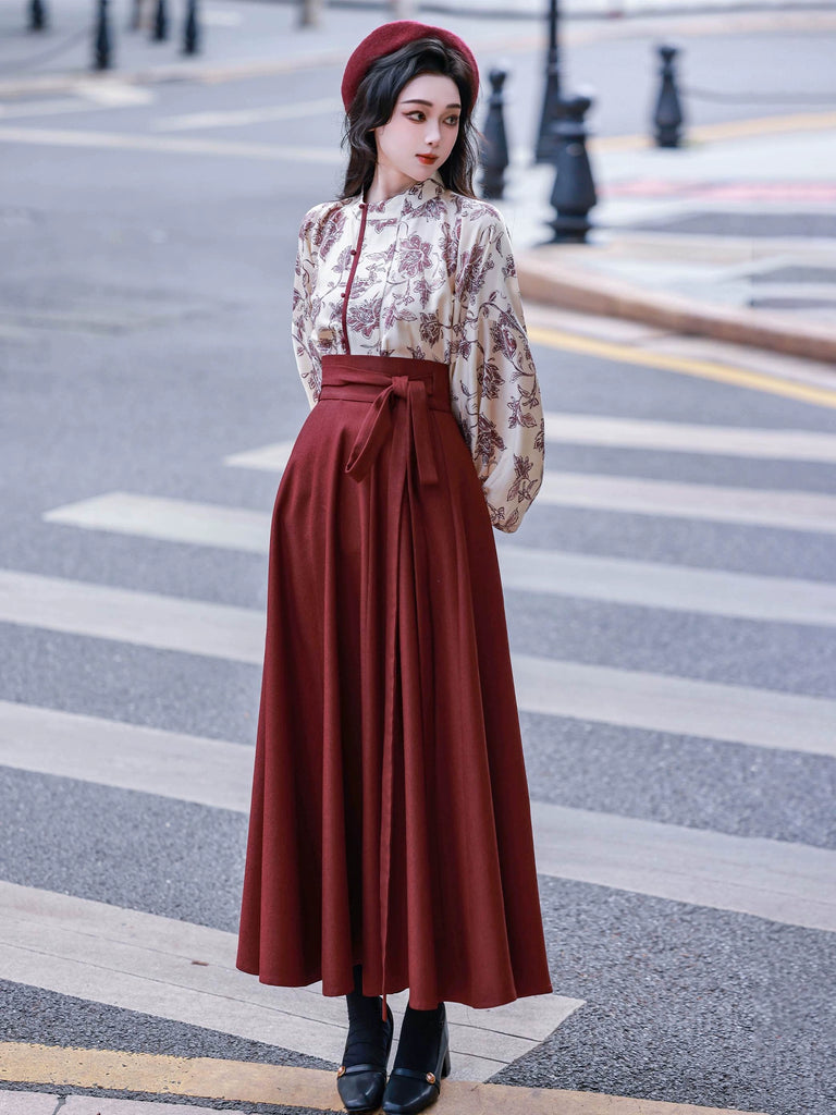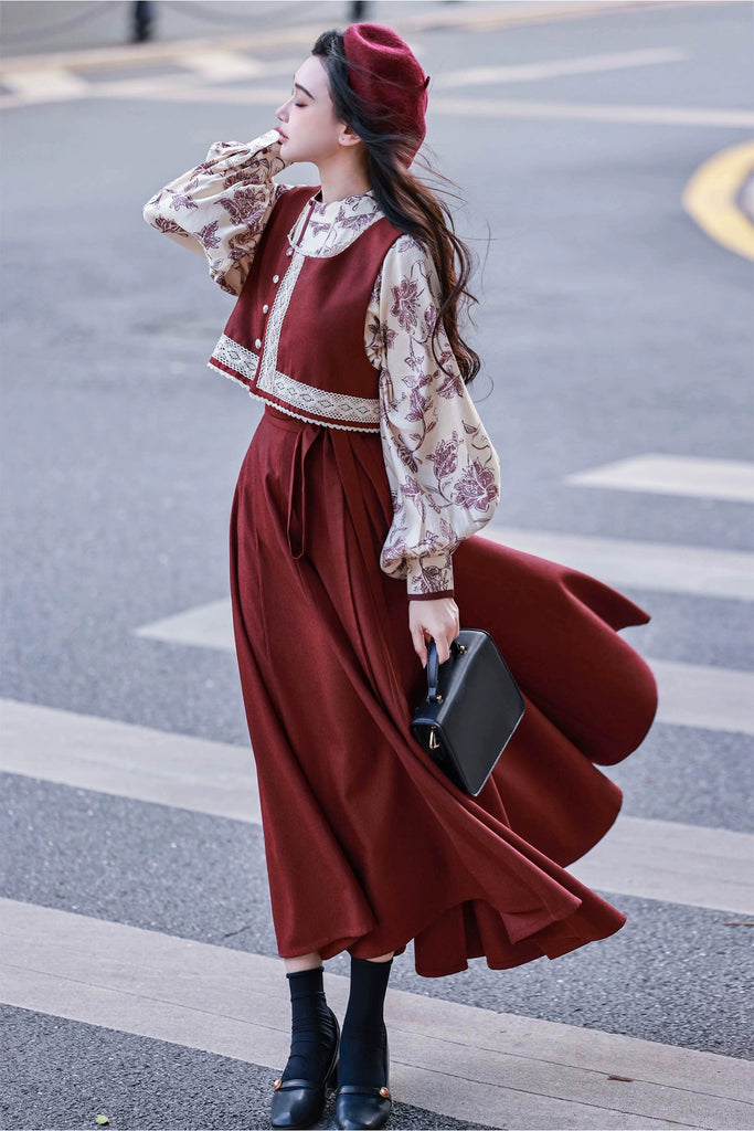 Mulan 木兰 - Hanfu-Inspired Outfit Vintage Red Round-Neck Top, Vest & Skirt (Preorder)