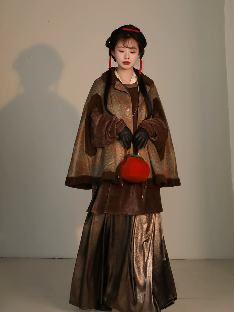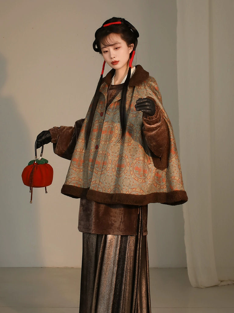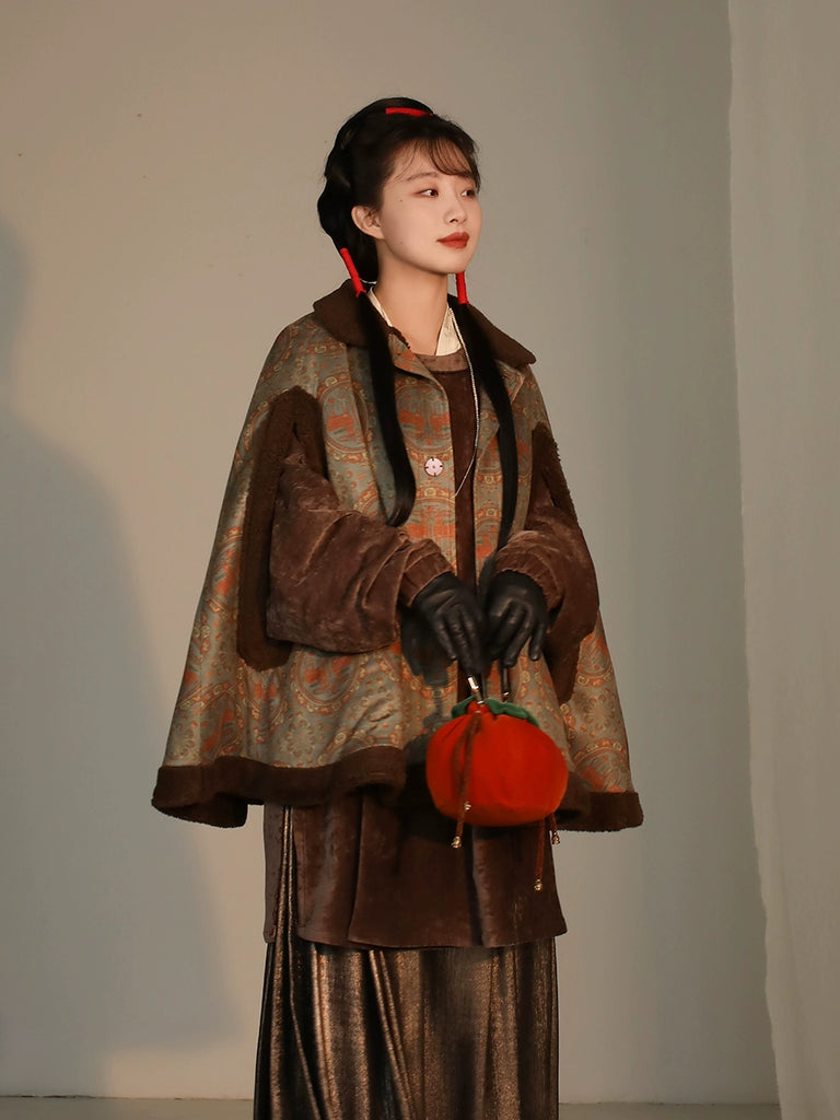 Shuanglu 双鹿 - Double Deer Embroidered Hanfu Cloak Thickened Winter Cape with Warm Fleece Lining