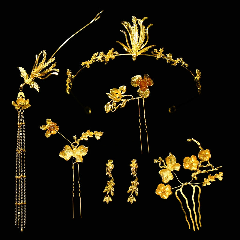 Glimmer of Red Blossoms - Gold Phoenix Bridal Hairband and Hairpin Minimalist Chinese Wedding Accessories