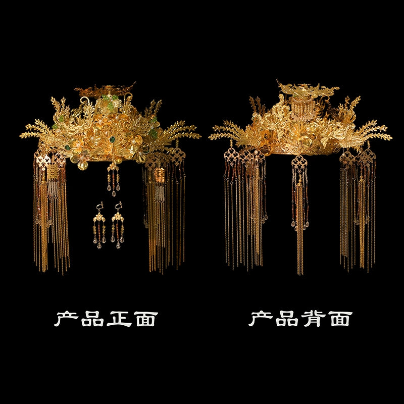 Starlit Phoenix Crown - Gold Bridal Headpiece Chinese Wedding Hair Accessories with Forehead Pendant