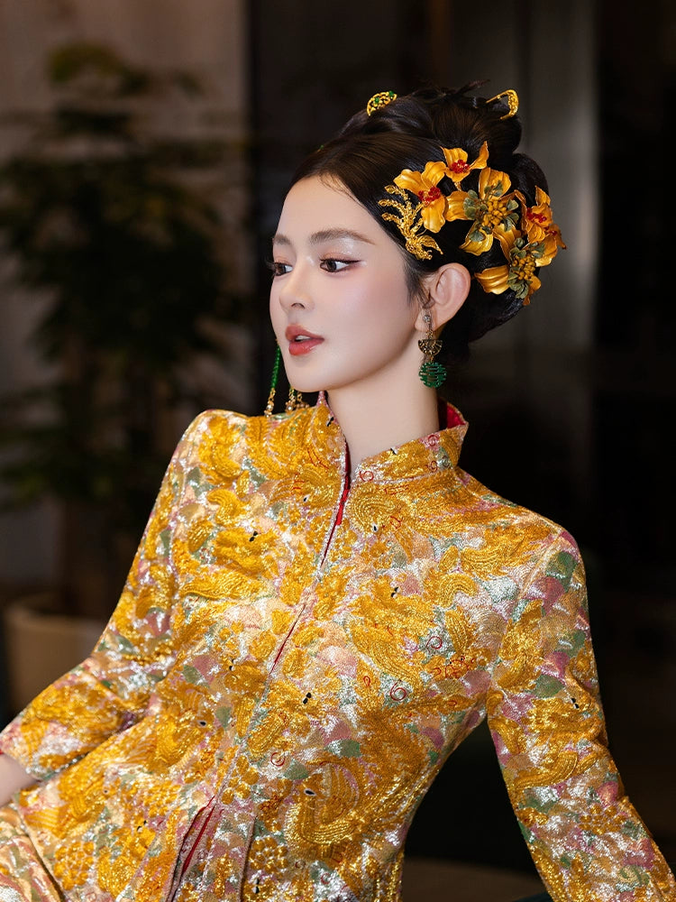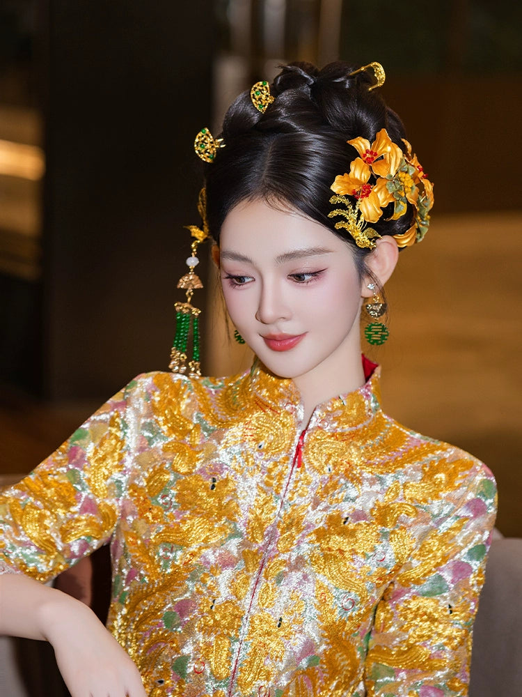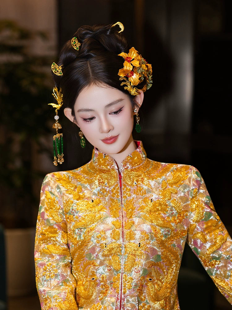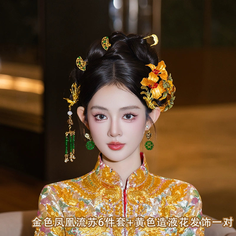Golden Flower Phoenix Bridal Hairpin Tassel Chinese Wedding Hair Accessories for Hanfu Bride