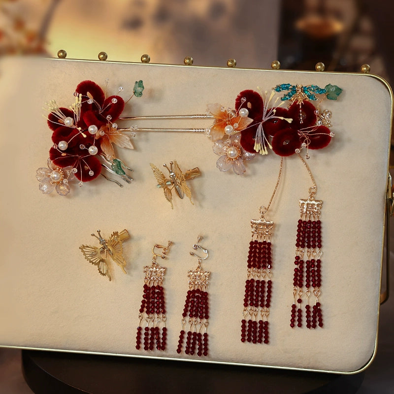 Fluttering Lotus - Red Velvet Butterfly Bridal Hairpin Tassel Chinese Wedding Headpiece for Xiuhe Dress