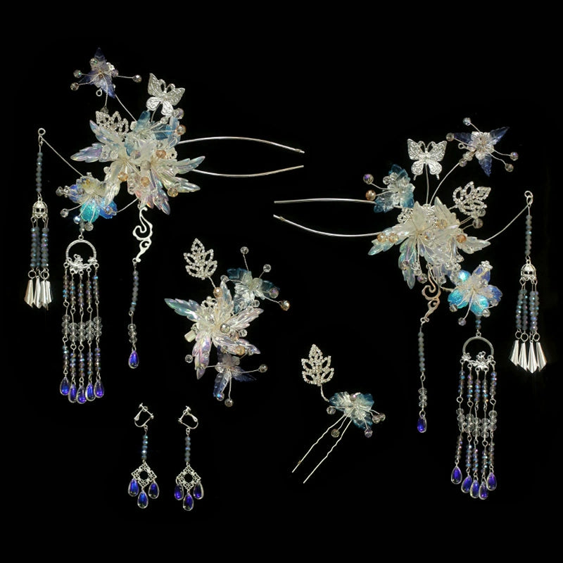 Winter Moonlit Blue Veil - Blue Floral Bridal Hairpin Ancient Style Hair Accessories for Hanfu and Wedding Dress