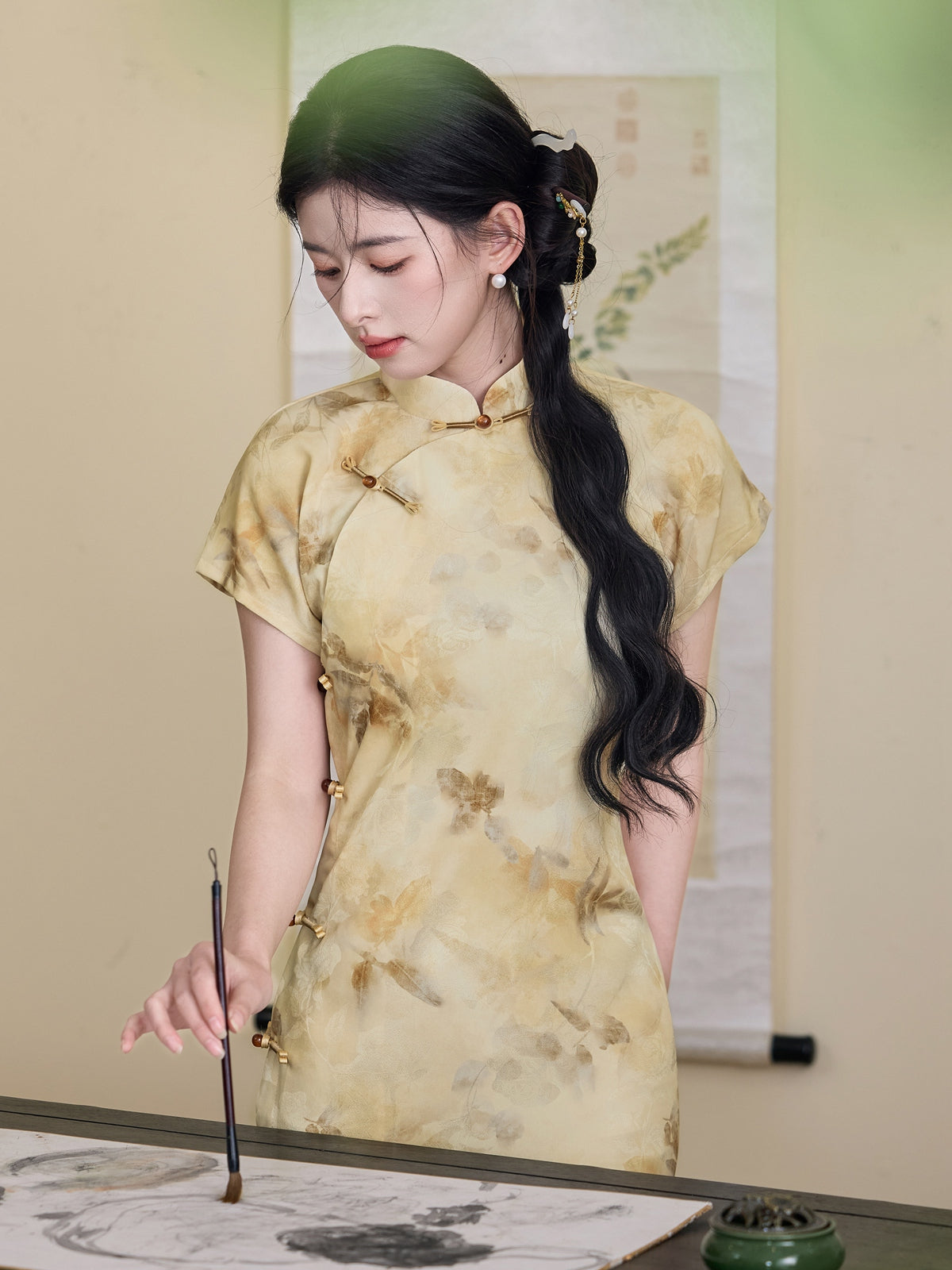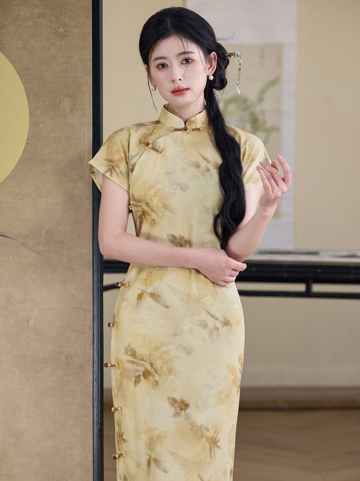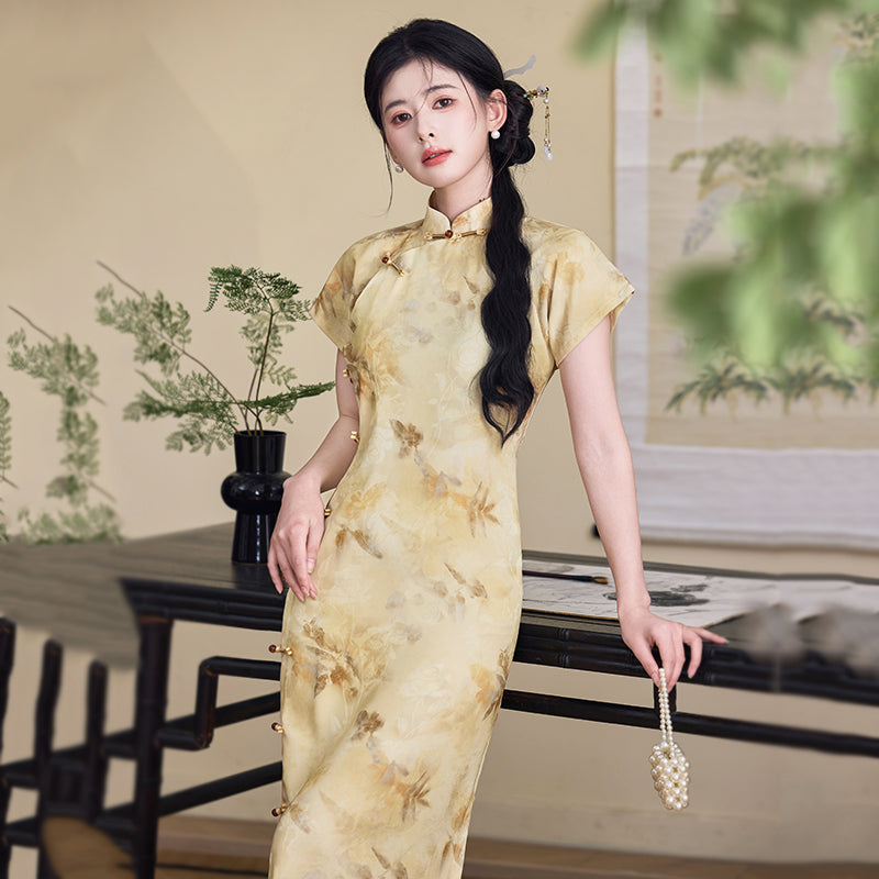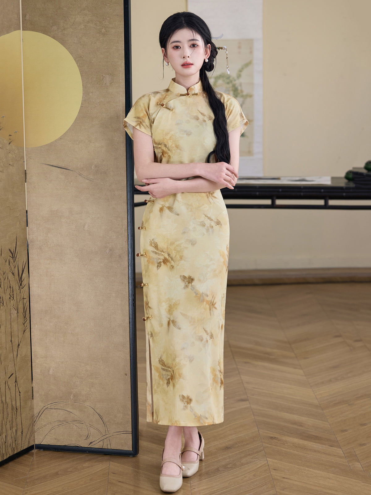 Golden Jade - Short Sleeve Vintage Style Long Cheongsam