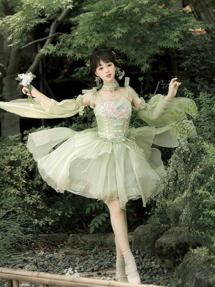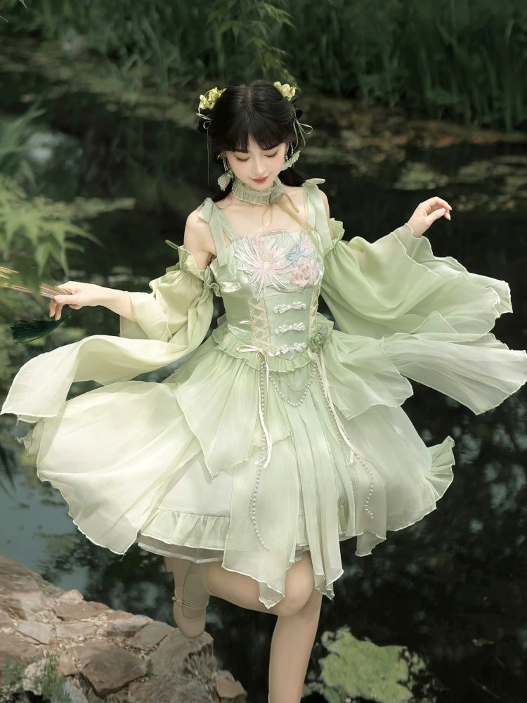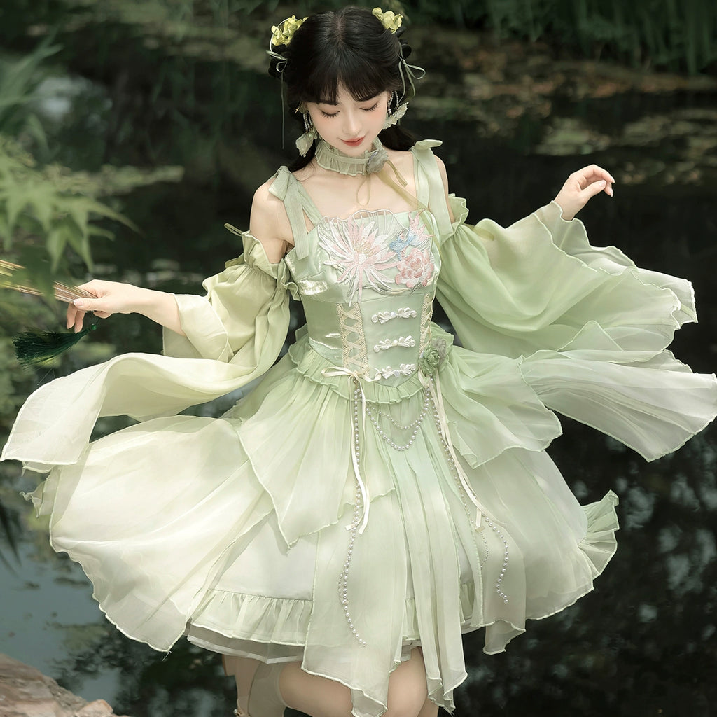 Qi Lolita, or Han Lolita blends elements of Lolita fashion with traditional Chinese attire like Cheongsam, or Qipao (Qing Dynasty) and Hanfu (Han Dynasty). Qi style often incorporates Qipao designs with Chinese-themed prints and mandarin collars. Han style focuses on high waistlines and long flowing sleeves. This collection includes Qi-style dresses, Han-style dresses, tops with Qiao-style collars, Chinese-inspired prints, and accessories.